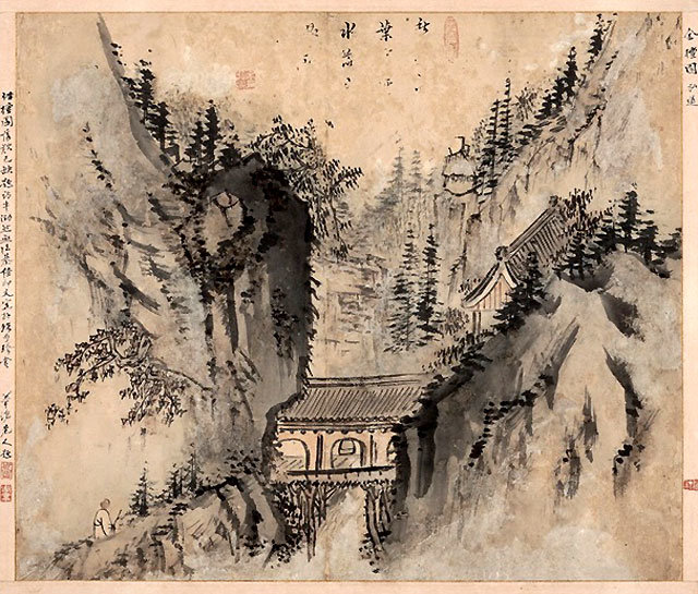 这幅画表现了拄着拐杖向着位于秋季深山溪谷的山寺行走的僧人。与谦斋郑敾(1676~1759年)不同,几乎没有留下实景的檀园的特性,被评价为珍贵的画作。但是,由于作品上端4行诗文遭到了很大破坏,因此,此前对于该作品的制作背景和时期的研究没有得到落实。最近,将画上留下的文字与古文献进行比较分析的过程中,确认了这些文字是跟石洲权韠(1569∼1612年)以“神光寺”为主题写的诗“落月疎钟古寺楼(在即将消失的月光下,稀疏的钟声从古山寺中传来)”一样的绝句。