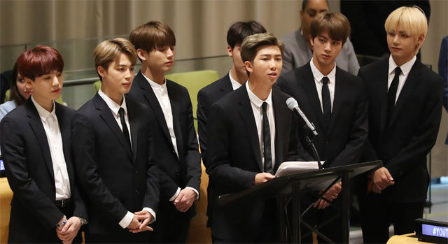 自称是京畿道一山(高阳市)出身的防弹少年团的队长RM金南俊(24岁)当天通过6分钟左右的英语演讲,用自己的真实故事引出了世界青年的共鸣。他回忆说:“小时候看到星星,想象着自己以后能成为拯救这个世界的超级英雄。从9~10岁开始,我开始在意周围其他人的评价和想法,为了迎合别人制造的框架而委屈自己。”他呼吁道:“我从音乐中找到了避风港,希望人们也能听从自己内心深处的声音。”