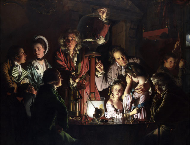 在250年前刮起产业革命风暴的时期,英国画家约瑟夫·赖特希望通过绘画展现当代科学世界。画中的科学家正在再现罗伯特·博伊尔的空气泵实验。在看热闹的人的注视下,他把装有鸟的玻璃桶里的空气排出,使之成为真空状态。在年轻观众大惊失色、放声大哭之前,他重新注入空气,奇迹般地救活了濒临死境的鸟儿。博伊尔发表气体的压力与体积的关系的“博伊尔法则”,是在1662年。赖特绘画时,空气泵已经是普及的科学装备,他几乎是在公开的场所收钱开办科学展。