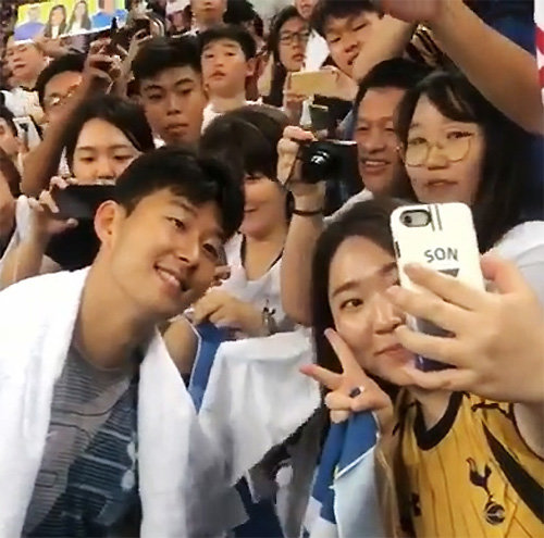 21日,孙兴慜在新加坡国家体育场举行的与尤文图斯队(意大利)的2019国际冠军杯(ICC)第一轮比赛中首发出场,在踢满上半场45分钟比赛之后,与平时一样和来到球场的当地球迷混在一起。从托特纳姆热刺队在赛后公开的Instagram视频来看,孙兴慜在比赛之后干脆直接来到观众席上,一一回应球迷的“自拍”要求。孙兴慜笑容满面地与球迷合影拍照,球迷们也为之陷入疯狂。在现场采访的某媒体表示:“孙兴慜在比赛结束后走到球迷面前打招呼时,警卫们试图制止观众,结果他自己也假装是观众。发现孙兴慜的警卫员笑着没有再制止球迷。”