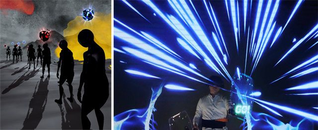 电影殿堂Cinemountin准备的《全息图剧场(Hologram Theatre)》则更进一步,戴着VR头戴式耳机的观众将在其他观众面前表演。跟着VR的影像做动作的话,就会配合投映到舞台的全息图的动作,像玩游戏一样用全息图盾牌挡住飞过来的各种形状的图形。