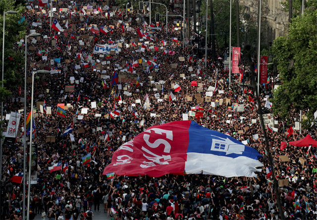 25日,在首都圣地亚哥,100万人参加了示威,这是历史上人数最多的一次。截止到当天,至少有18人死亡,7000多人被捕。为安抚民众情绪,塞巴斯蒂安·皮涅拉总统26日宣布改组内阁,但示威者的愤怒情绪依然存在。他们要求皮涅拉总统取消18日宣布的国家紧急状态,在社会各领域进行改革。他们在社交媒体上上传了名为“智利最大的游行”的标签,强调眼下将继续进行示威。