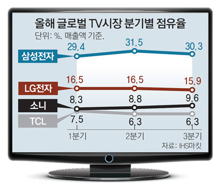 三星电子今年第三季度(7~9月)全球电视机市场占有率(以销售额为准)达到30.3%,从2006年开始一直保持世界第一的位置。