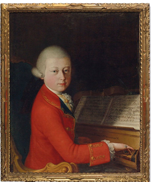 这幅油彩画是莫扎特生前仅创作的4幅肖像画之一。1770年,由意大利画家赞维蒂诺•奇尼亚罗利创作。画中13岁的莫扎特头戴白色假发,身穿红色礼服,手指放在一种拨弦古钢琴的琴键上,看着乐谱进行演奏。佳士得拍卖行的一位有关负责人表示:“有人分析说,该乐谱可能是莫扎特本人创作的乐谱。”
