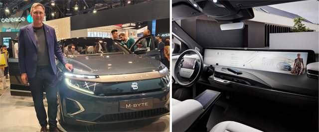 当天在现场展示的拜腾主力车型M-Byte是拥有玻璃材质的车顶、内部正面48英寸曲面屏幕和Level4无人驾驶(只有在紧急时刻驾驶员才会介入的完全自动行驶)的未来型汽车。戴雷博士表示,“此前在车上的时间一直都是浪费时间。我们想把它打造成家庭生活、工作和社会活动的基地。”