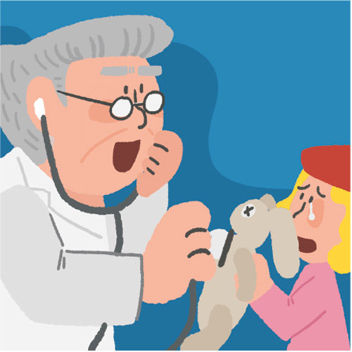 就像是到了韩式中医院那样,医生在孩子的手腕上按着四个指头,看着手表,量着脉搏。更确切地说,医生并没有把手指按在孩子的手腕上。孩子身材很小,手臂都能被医生的手指遮挡住。无论是诊脉的医生,还是担心地凝望着他的的少女,表情都十分严肃。可是,医生诊治的孩子其实就是穿黄色睡衣的洋娃娃。令人啼笑皆非的是,医生不是在给人看病,而是在为洋娃娃看病。