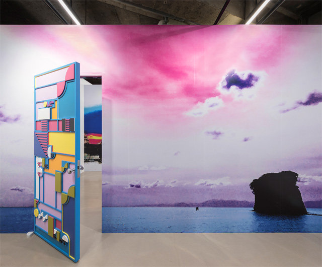 从远处看,原本是充满图案的平面墙,但仔细一看,墙面是凸出的。在平静大海一望无际的和平风景照片中,打开门出去就会看到智能手机、香烟、墓碑扩大的照片。看着让人头脑混乱的形象盛宴,我产生了这样的想法。用眼睛看的真的是纯粹的吗?这难道不是不断被认识所左右吗?
