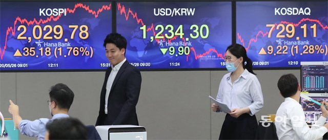 26日,韩国综合股价指数比前一个交易日上涨35.18点(1.76%),以2,029.78点收盘。继前一交易日上涨1.24%后,连续两天涨幅超过1%。综合股价指数以收盘价为基准超过2000点是自3月6日(2,040.22)以后的第一次。KOSPI大将股三星电子上涨了0.82%,SK Innovation(14.15%)、三星SDI(11.49%)、LG化学(6.29%)等市价总额上位股中,因新冠肺炎疫情股价大幅下跌的证券都显示出走强势头。