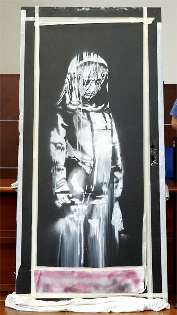 据悉,2018年6月首次登场的该作品是班克斯为纪念2015年11月13日当时正在举行音乐会的巴黎巴塔克兰剧院90人丧命的恐怖事件而创作的。在剧场的黑色紧急出口用白色蜡纸印哭泣的少女形象的该作品,被巴黎人视为“记住恐怖之痛的象征”。但是2019年1月,画有该作品的门被整个撬开后失窃。