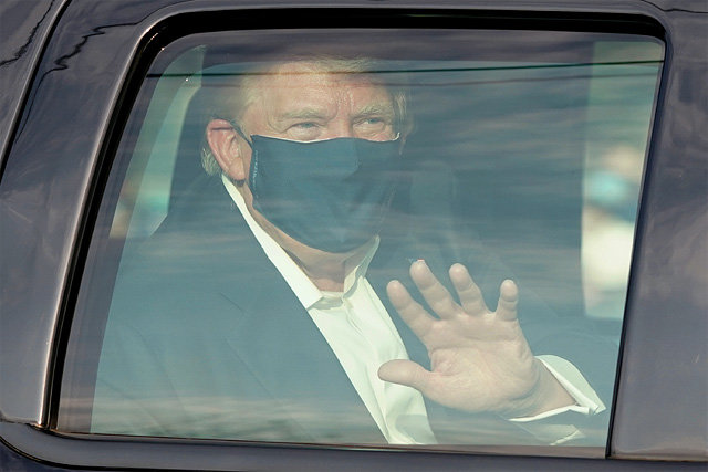 特朗普乘坐汽车前往支持者聚集地,他在后座上戴着口罩坐着,朝欢呼的支持者挥手致意。窗户是关着的。虽然与支持者们没有直接接触,但是有批评指出总统违背了防止防控新冠病毒的基本原则。因为新冠感染者为了防止更多感染,原则上在痊愈之前不能外出。