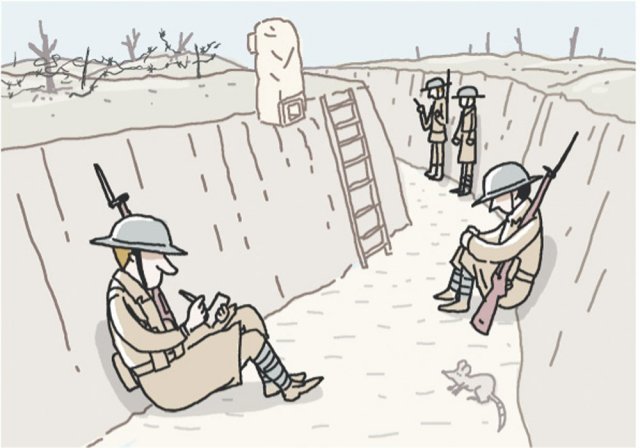 即使雨过天晴,战壕也不会变干净。地面变得泥泞,士兵们的生活像泥泞中的生活。双排扣风衣与现在使用的军用雨衣不同,看起来像日常雨衣。令人纳闷,为什么要把军用雨衣做成这个样子。难道是因为这个时代存在相比实用更注重时尚的浪漫观念?说实话,笔者不知道正确答案。只是,即使是晴天,战壕也是泥泞的,所以在雨季,即使是晴天,战士们也得住在水和泥土里。笔者估计,所以选择了日常服装形式的防水服。