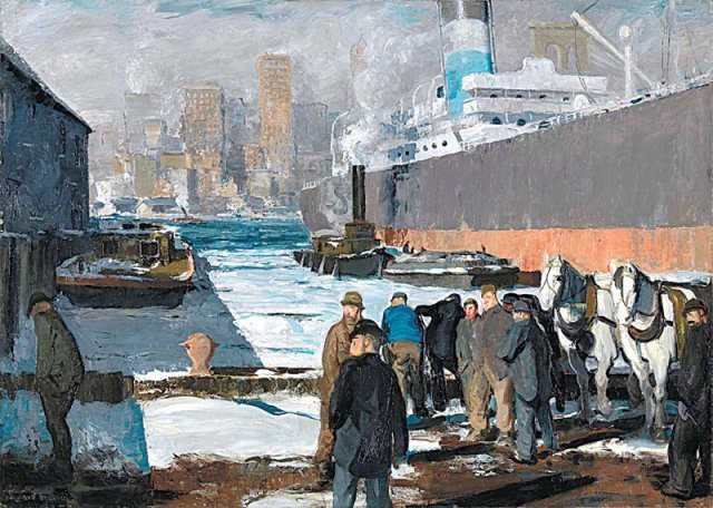 冬天在布鲁克林码头边,一群工人正焦急地站着等待着什么。今天有工作吗?他们负责的是从停泊的船上装载马匹和货物的工作。虽然是低工资,但也很难找到工作。画面左侧的男子可能是没找到工作,低着头。工友们看着他的心情似乎也不舒服。隔岸曼哈顿,富人们居住的高楼大厦竞相站立着。这是亲手建造那些大楼的工人一辈子梦寐以求的房子。粗糙冰冷的江水则起着彻底区分城市贫民和富人的警戒作用。对于失去希望的他们来说,生活会不会像扔在烟灰缸里的烟灰一样灰暗呢?画家通过贫困工人的形象,真实地展现了华丽的城市纽约的另一面。