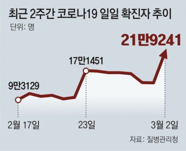 방역 당국에 따르면 2일 오전 0시 기준 신규 확진자는 21만9241명으로 전날보다 8만 명이상 급증했다. 하루 확진자가 20만 명을 넘어선 건 처음이다. 방역 당국은 대선(9일) 전후 확진자 하루 23만 명대를 예측했었다. 실제 확산 속도가 예측보다 일주일 이상 빠른 것이다. 김부겸 국무총리는 이날 “청소년 중심으로 감염이 더 확산될 수 있다”고 말했다.