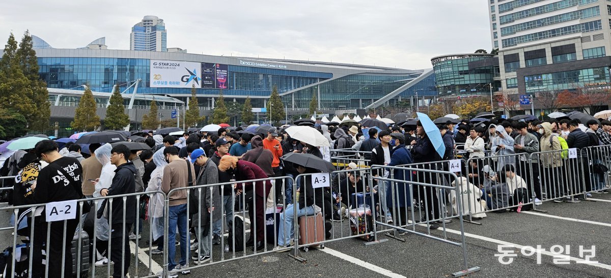 在釜山会展中心开幕的国内最大的游戏展示会“G-STAR 2024”的第二天,即15日上午8时,雨滴开始落下,但参观者的热情丝毫未减。展厅前设置的等候场所因等待入场的游客从早上开始就人山人海。