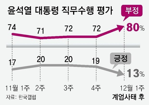 6일 한국갤럽이 발표한 12월 첫 주 여론조사 결과(중앙선거여론조사심의위원회 인터넷홈페이지 참조)에 따르면 윤 대통령 직무수행은 계엄 선포 전인 3일에는 긍정 평가가 19%, 부정 평가가 68%였으나 계엄 선포 및 해제 이후 실시된 4∼5일 조사에서는 각각 13%, 80%였다.