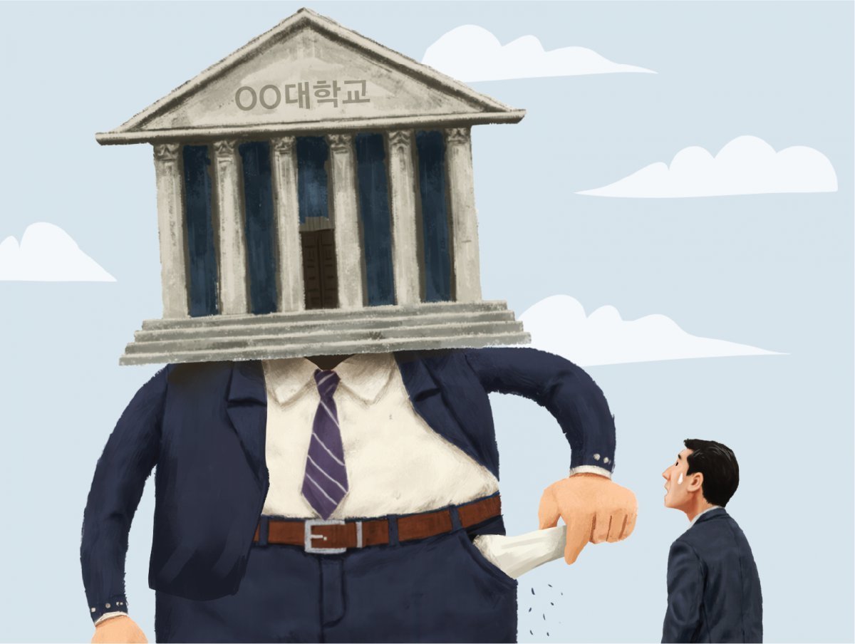 即使以比国立大学更贵的4年制私立大学为标准,目前的大学学费也比被称为“英语幼儿园”的幼儿英语补习班、私立小学、初中、高中、复读补习班、甚至伴侣犬幼儿园便宜。据韩国私立大学校长协议会透露,如果将4年制私立大学的月平均教育费定为1,那么幼儿英语补习班为2.9、国际高中3.9、复读寄宿补习班7.8、宠物犬幼儿园1.6等。据韩国私立大学校长协议会透露,以去年为准,达不到4年制大学名义学费平均值(682.9万韩元)的大学占全体大学(190所)的37.4%(71所)。