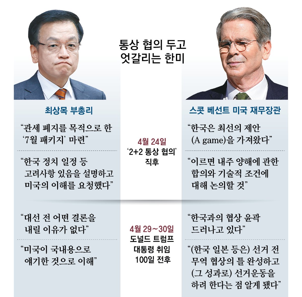 围绕关税磋商,韩美政府经济负责人发表了不同内容的言辞,温差正在增大。韩国副总理兼企划财政部部长崔相穆表示,“没有理由在总统选举前下结论”,再次确认“美方没有施压尽快达成协议”的政府立场。美国财政部长贝森特则明确表示,“韩国将在总统选举前结束磋商,并以此成果进行选举运动”。