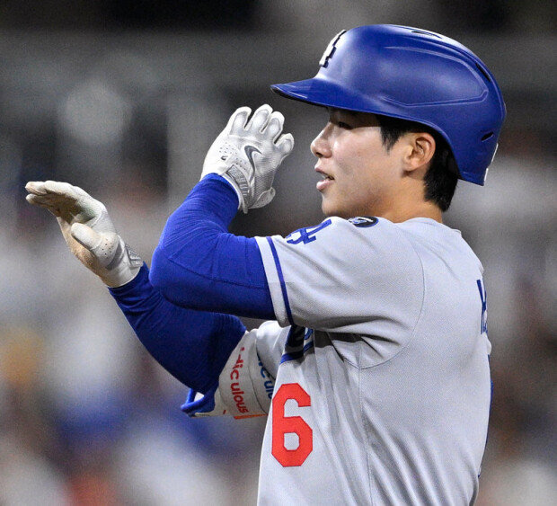초구에 헛스윙하면서 타석을 시작한 김혜성은 마쓰이가 두 번째 공으로 시속 143km짜리 몸쪽 슬라이더를 던지자 다시 방망이를 휘둘렀다. 1루 선상으로 빠진 타구는 오른쪽 담장 구석까지 굴러갔다. 김혜성이 2루에 도달하는 사이 2루 주자 맥스 먼시(35)가 홈을 밟으면서 6-6 동점이 됐다.