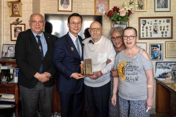 LIG Nex1公司16日(当地时间)宣布,其代表申翼铉在法国巴黎向联合国军参战老兵塞尔日•阿尔尚博(95岁)先生颁发了感谢牌并赠送了纪念品。