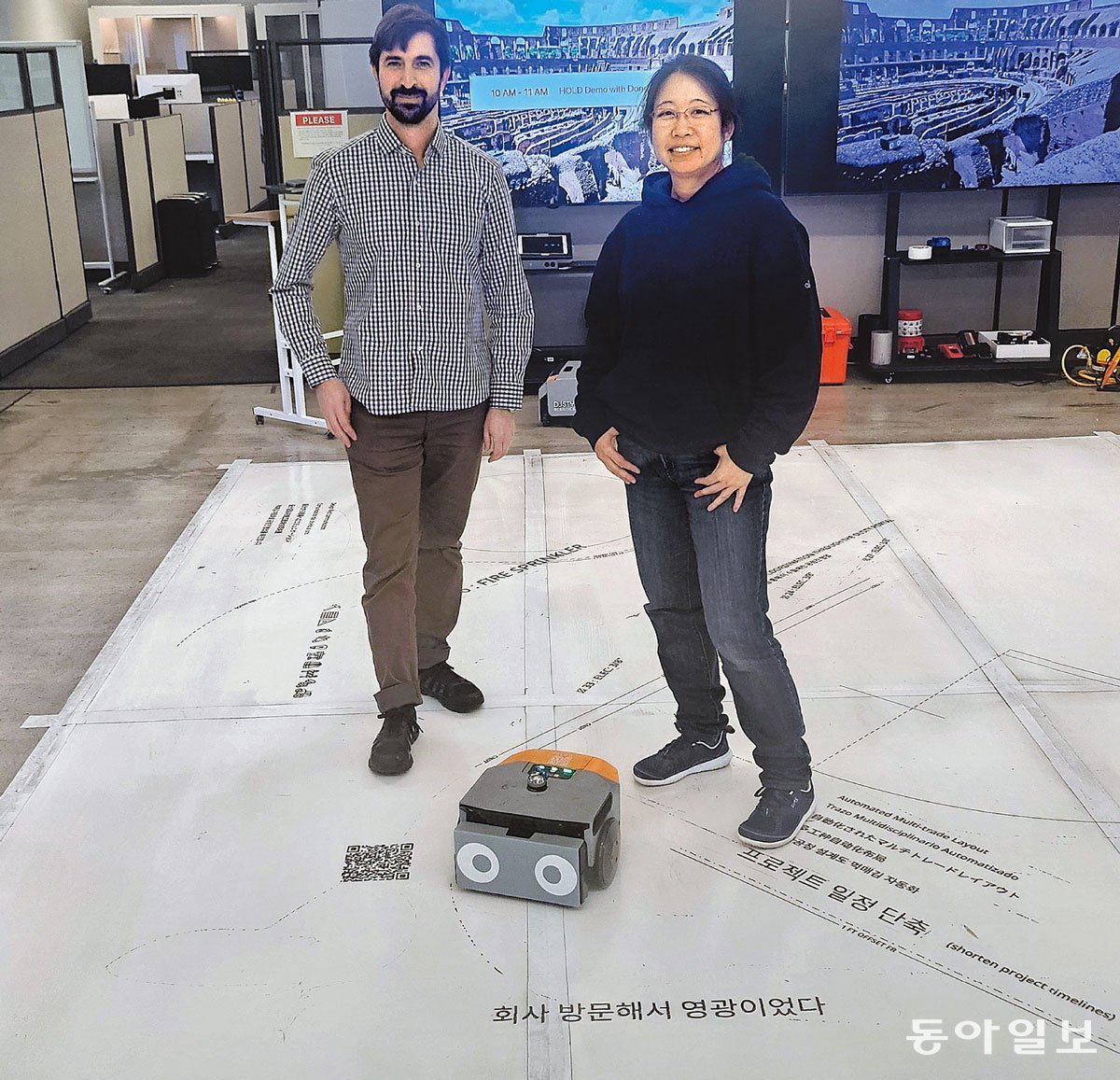 当地时间去年12月16日,位于美国加利福尼亚州硅谷附近山景城的机器人创业公司达斯蒂机器人。在这里,长得像吸尘器一样的小机器人正在白地上忙碌着。机器人经过的地方地面上,画出了包含建筑物外形、管道位置等的设计图,上面刻着英语、西班牙语、韩语等多种语言的施工指南。不同国籍的现场工作人员可以不受语言障碍的影响进行工作。