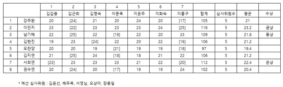 ¡¡¡¡2. °¢ Ã⿬ÀÚ¿¡ ´ëÇÑ ÃÖ°íÁ¡¼ö¿Í ÃÖÀúÁ¡¼ö¸¦ Á¦¿ÜÇϰí Áý°èÇÔ.