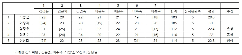 ¡¡¡¡2. °¢ Ã⿬ÀÚ¿¡ ´ëÇÑ ÃÖ°íÁ¡¼ö¿Í ÃÖÀúÁ¡¼ö¸¦ Á¦¿ÜÇϰí Áý°èÇÔ.