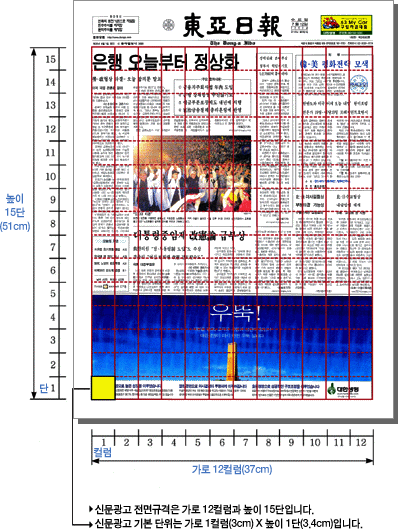 ½Å¹®±¤°í´Â ½Å¹® ÇѸé(¼¼·Î15´Ü * °¡·Î12Ä®·³)¾È¿¡¼ Ç¥ÇöÇÒ ¼ö ÀÖ´Â Å©±â¿¡ µû¶ó µ¹Ãâ, 5´Ü, 7´Ü, 8´Ü, 10´Ü, 15´Ü µîÀ¸·Î ºÐ·ùµÇ¸ç ±× Å©±âÀÇ ±âÁØÀº 1´Ü,1Ä÷³ÀÔ´Ï´Ù.