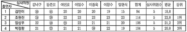 2.°¢ Ã⿬ÀÚ¿¡ ´ëÇÑ ÃÖ°íÁ¡¼ö¿Í ÃÖÀúÁ¡¼ö¸¦ Á¦¿ÜÇϰí Áý°èÇÔ (¡ÛÇ¥ÇÑ ¼ýÀÚ´Â ÃÖ°íÁ¡ ¶Ç´Â ÃÖÀúÁ¡) |