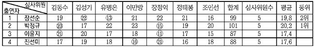 2.°¢ Ã⿬ÀÚ¿¡ ´ëÇÑ ÃÖ°íÁ¡¼ö¿Í ÃÖÀúÁ¡¼ö¸¦ Á¦¿ÜÇϰí Áý°èÇÔ (¡ÛÇ¥ÇÑ ¼ýÀÚ´Â ÃÖ°íÁ¡ ¶Ç´Â ÃÖÀúÁ¡)