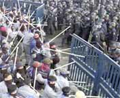 Some 350 dismissed workers wielding iron pipes and truncheons came to blows with police while attempting to join other protesters and their families inside the plant`s main gate. About 10 unionists were hurt in the violence.