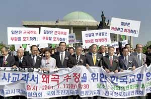 300 members of the National Council of Churches In Korea are marching early morning yesterday in front of the National Assembly after breakfast prayer meeting for the revision of the Japan’s history textbooks.