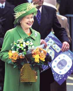 Britains Queen Elizabeth II smiles after receiving a congratulations card and flowers during her visit to a hospital named after her in Norfork on the 6th, which marked the 50th anniversary of her accession to the throne.