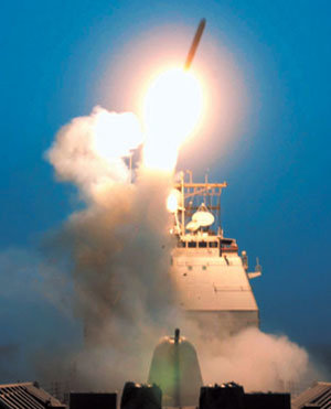 A Tomahawk cruise missile is being fired from USS Bunker Hill to major Iraqi military facilities on March 20. Beginning attack on Iraq, the United States air-raided "targets of opportunity" including those in Baghdad and other Iraqi army bases deployed along the Kuwaiti border.