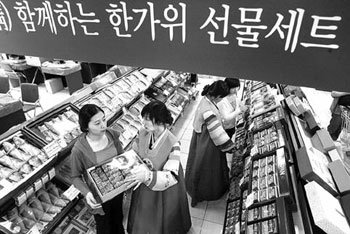 Customers ask about gift sets to the sales clerks of the Chuseok gift set section on Sunday at the Hyundai Department Store in Changcheong-dong, Seoul.