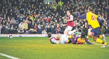 Burnley FC player Kevin McDonald scores past defenders of Arsenal FC in the semifinal of the English Premier League`s Carling Cup. Burnley won, 2-0.