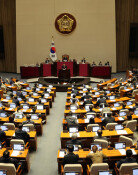 Some 100 residents of Yeongi County, South Chungcheong Province, yesterday protest a police blockade preventing them from entering the venue of a government-held forum in Seoul on the proposed revision of the new administrative city to be built in the county. They said the forum should not have been held before all of them were allowed to attend, causing a delay of nearly 50 minutes.