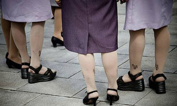 The U.S.-based Radio Free Asia yesterday released photos of North Korean women in Pyongyang taken by foreigners in front of the Kumsusan Memorial Palace. Quoting American economist Curtis Melvin, the report said stockings that make womens ankles look as if they had tattoos are popular in the communist country.