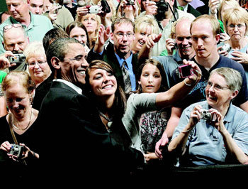 28일 미국 일리노이 주 퀸시를 방문한 버락 오바마 대통령이 주민들에게 월가 개혁의 당위성을 역설한 뒤 함께 기념사진을 찍고 있다.