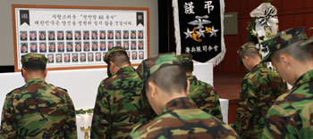 Naval servicemen pay tribute in front of a memorial altar set up at the 6th Marine Brigade on Baengnyeong Island Friday on the occasion of the first anniversary of the sinking of the South Korean warship Cheonan. North Korea torpedoed the vessel on March 26 last year, killing 46 sailors.