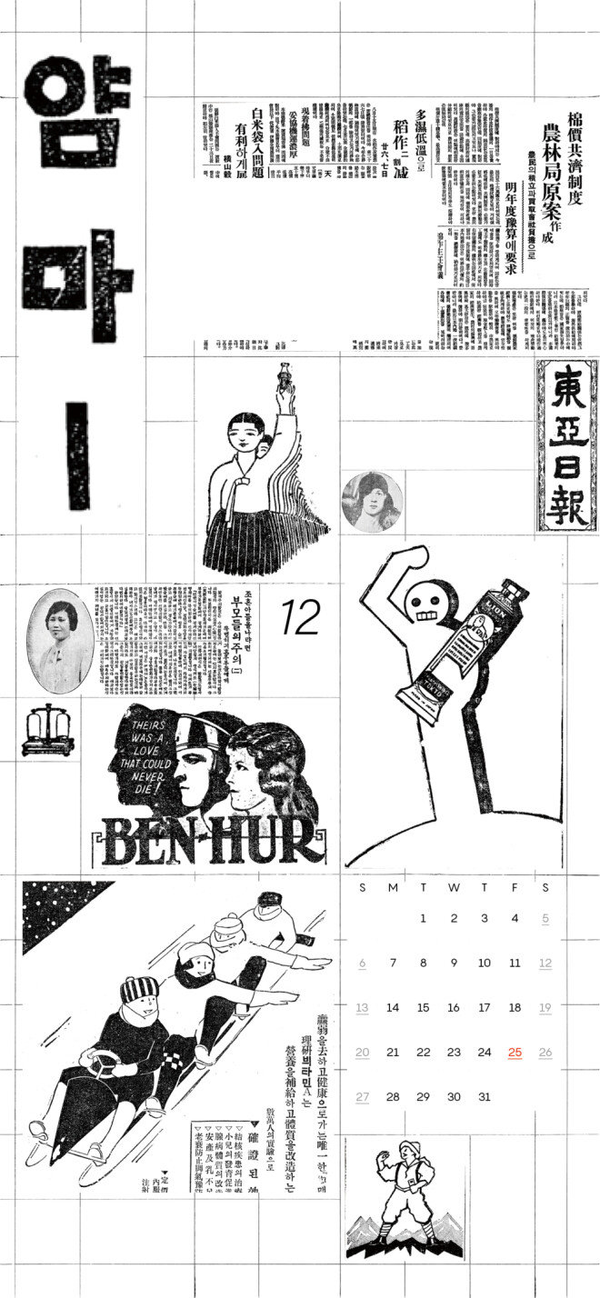 동아일보 창간 100주년을 기념하여 옛 신문 삽화를 활용한 스마트폰 배경화면 겸 달력을 디자인했습니다.