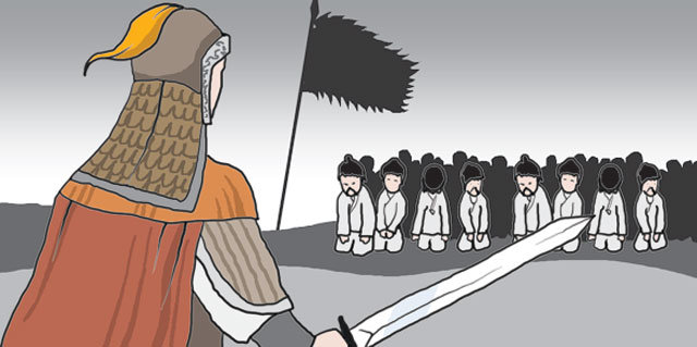 戦国時代が最後(収束)に向かっていた頃。秦の名将、白起は、紀元前262年、長平で趙の軍隊に大勝を収めたが、降参した捕虜40万人を虐殺した。誇張された数だが衝撃的な大量虐殺であったのは明らかだ。白起は後に謀略によって死ぬことになった。「私が何の罪を犯してこのような屈辱を受けるのか」と悔しがった白起は、ふと趙の捕虜殺害事件を思い出し、「天があの罪を罰するのだな」とつぶやいたという。