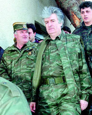 ラドバン・カラジッチ元ボスニアセルビア系大統領(中央)が1995年4月、ムラジッチ(左)軍司令官など、当時のボスニア軍のトップたちと一緒に歩いている。セルビアはまだ捕まっていないムラジッチ司令官の逮捕に全力を傾けると明らかにした。
