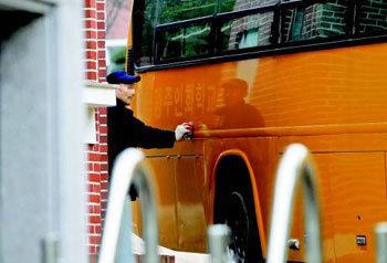 00年から障害者への性的暴力事件が発生した光州市光山区三道洞(クァンジュシ・クァンサング・サムドドン)のインファ学校。ある教職員が通学車両に書かれている「インファ学校」の表示を消している。