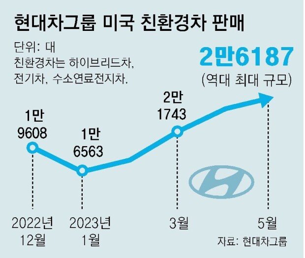 이 가운데 전기차와 하이브리드차 등 친환경 차량의 성장세가 눈에 띈다. 현대차와 기아는 지난달 미국에서 총 2만6187대의 친환경차를 팔았다. 기존 월간 최대 기록인 4월 기록(2만4702대)을 넘어서면서 2개월 연속 월간 최다 판매 기록을 갈아치웠다.