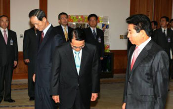 盧武鉉(ノ・ムヒョン)大統領が23日午前、大統領府で新任の金章洙(キム・ジャンス)国防部長官(左側)と金萬福(キム・マンボク)国家情報院院長(中央)に任命状を授与するため、執務室に入っている。