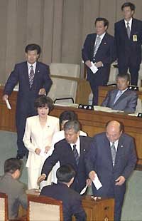 仮処分申請を棄却させて追込まれたパク部長判事と遺書代筆事件の捜査責任者として論議を起こしたカン高等検察庁長はそれぞれ67と69の反対票を得た。残り4人の候補は20‾22票の反対票があった。民主党とハンナラ 党はこの日、賛成・反対の党論を決めず、議員の自由投票に任せた。自民連は院内交渉団体の構成問題を理由に票決には参加しなかった。