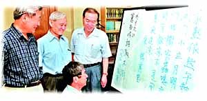 李炳漢(イ・ビョンハン)教授(左)と同僚教授らがャ刀Eデイの漢詩を見ながらお互いに評を論じあっている。