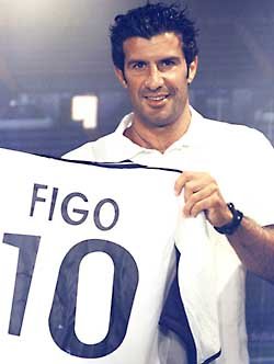 史上最高の移籍料616億ウォンでスペインプロサッカーのマドリードに移籍したポルトガルのサッカーのスター、ルイス・フィーゴが新しいユニフォームを持って爽やかに笑っている。