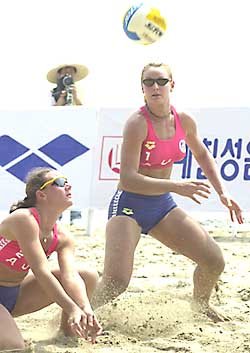 26日、コジェのハクトン競技場で行われた世界女子スーパー・ビーチバレーボール大会の韓国とオーストラリア戦でオーストラリアのナターシャ・コンスタント選手が砂浜に身を投げてスパイクを拾っている。