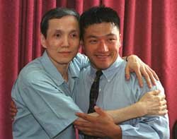 27日、クァンジュ刑務所で死刑囚として服役中の父(左)が27年ぶりに再会した息子(韓国系米軍)と抱き合っている。